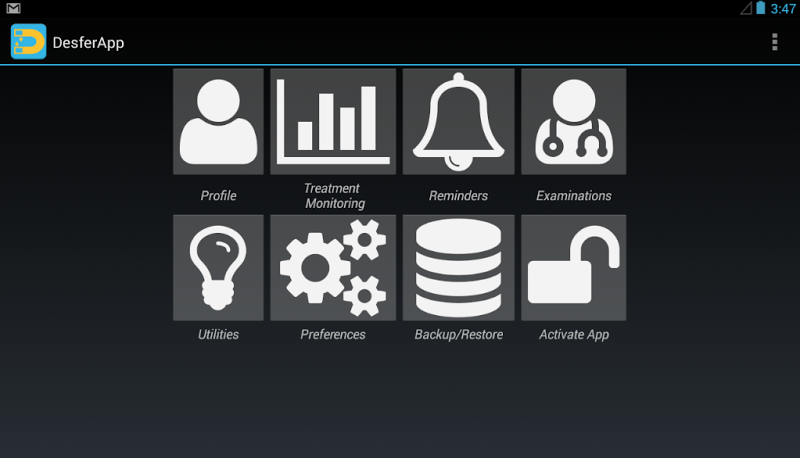 Cílem Desferapp je posílit soulad s chelatační léčbou multi-přenosovaného pacienta. Aplikace podporuje dlouhodobou terapii thalassemického pacienta dvěma způsoby: a) snižuje počet vynechaných dávek léků prostřednictvím připomenutí dávky, (b) umožňuje monitorování přijaté léky a pokrok chelační terapie. Osobní údaje uživatele jsou uloženy lokálně ve svém smartphonu a nejsou přenášeny z žádného důvodu pro třetí strany.Aplikace je zdarma a je podporována reklamami. Uživatel může deaktivovat reklamy prostřednictvím nákupu licence od Google Play.