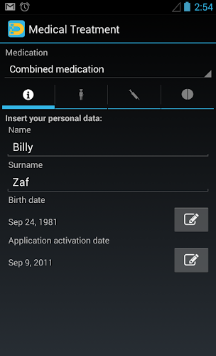 1. Správa osobních informací o chelataci. Aplikace podporuje tři různé typy léků: a) deferoxamin, b) deferipron a c) kombinovaný deferoxamin/deferipronový lék.