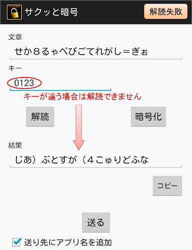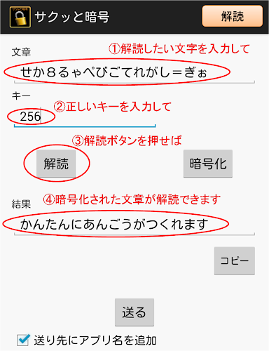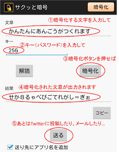 Je to aplikace, která vám umožní vytvořit jednoduchý šifrovací text Hiragany.Zadejte text, který chcete šifrovat, a poté šifrován klíčem (heslem) pro dešifrování.