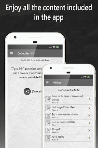 Stáhněte si nyní aplikaci smutných citací, kterou můžete sdílet se svými přáteli a blízkými (včetně smutné zprávy a smutné fráze), která je k dispozici pro mobilní zařízení Android.sadness quotes je aplikace s velkou sbírkou frází smutku a slavných citátů, je velmi snadno použitelná, rychlá a s intuitivním uživatelským rozhraním.