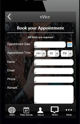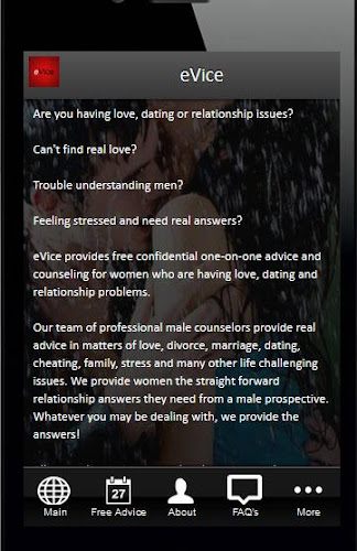 the first real app that gives women free access to expert relationship advice 24 hours a daye-vice provides free confidential one-on-one advice and counseling for women who are having love, dating and relationship issues.our team of professional male counselors assists you with family, marital, divorce, separation, stress, break ups, infidelity and many other life challenging issues. Poskytujeme ženám přímý vztah odpovědí, které potřebují od mužského prospektivního.