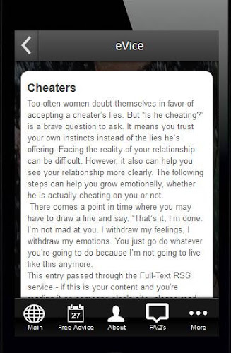 the first real app that gives women free access to expert relationship advice 24 hours a daye-vice provides free confidential one-on-one advice and counseling for women who are having love, dating and relationship issues.our team of professional...