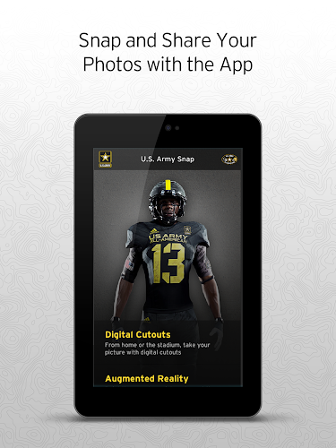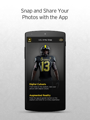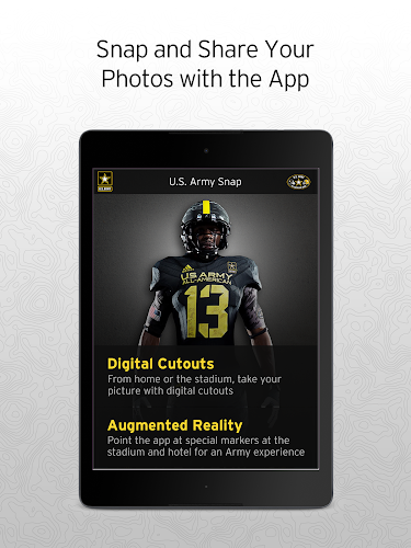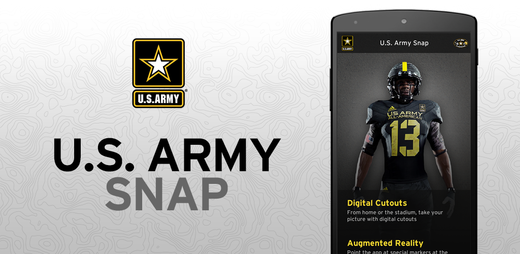 nás. Army Snap je zábavná, pohlcující aplikace, která vám umožní zažít USA Armáda All American Bowl jako nikdy předtím. Vyfoťte svůj obrázek s 3D vojáky, prakticky držte trofej Ken Hall a vezměte si selfie nosí armádní šaty blues. Klíč hotelu můžete dokonce použít k získání speciální uvítací zprávy!a když jste u toho, sdílejte své snímky prostřednictvím sociálních médií a informujte své přátele a rodinu vědět, že jste součástí týmu!
