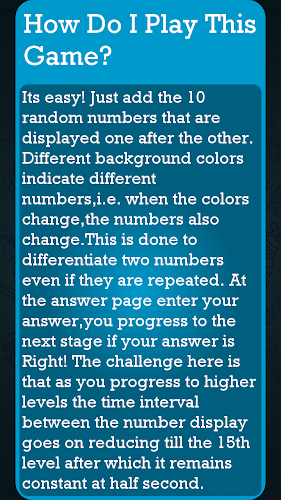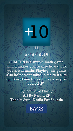 SUM 10 je jednoduchá čísla hra, kde přidáte 10 náhodných čísel, která se objeví jedna po druhém. Není to tak jednoduché?Poznámka: Neobviňujte nás, pokud po přehrávání této hry vybijete telefon z frustrace. Veškerá vina jde na Archimedes, Bovarian, Brahmagupta, Pythogoras, Euler a váš učitel matematiky.