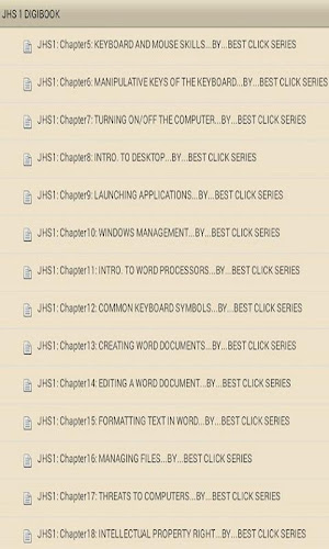 Tato aplikace je verzí Android verze učebnice Best Click Series ICT pro studenty JHS 1 a učitelů ICT v Ghaně. Tato aplikace pro Android Digibook byla vytvořena tak, aby byla výuka a učení IKT v Ghaně po ruce a povzbudila studenty v Ghaně, aby používali své telefony a tablety pro Android pro učení. Otevření tak, aby se objevila přesně jako kniha o zařízení* Snadná navigace do kapitol s úplným seznamem kapitol
