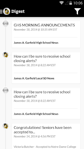 Je to všechno, co byste mohli chtít vědět o Jag Schools v jednom snadno použitelném, mobilním umístění! Vlastní okresní aplikace James A Garfield místní školní čtvrti z Blackboard dává rodičům a studentům jednorázové místo pro přístup ke všem důležitým informacím o okresech a školách kdykoli během dne nebo noci.Nyní mají rodiče a členové komunity centrální rozbočovač se všemi nástroji, které potřebují k tomu, aby zůstali v kontaktu s nejnovějšími zprávami a upozorněními včetně: