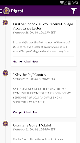 Je to všechno, co byste mohli chtít vědět o Grangerově nezávislé školní čtvrti v jednom snadno použitelném, mobilním umístění! Aplikace Granger Independent School District App District/School App od Blackboard dává rodičům a studentům jednorázové místo pro přístup k Edline a všechny vaše důležité informace o škole kdykoli nebo v noci.Nyní mají rodiče a členové komunity centrální rozbočovač se všemi nástroji, které potřebují k tomu, aby zůstali v kontaktu s nejnovějšími zprávami a upozorněními z Grangerovy nezávislé školní čtvrti včetně: