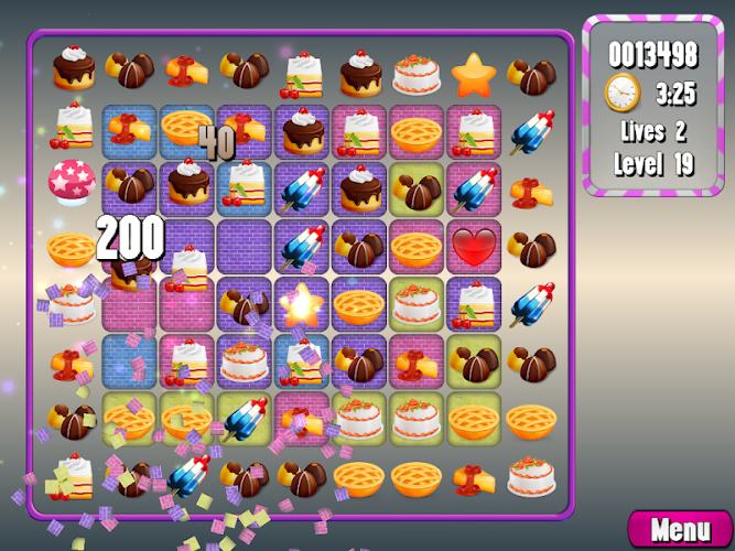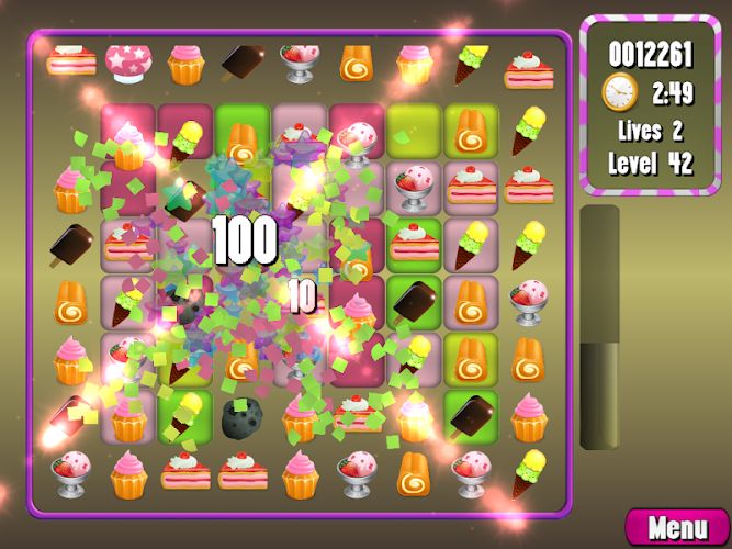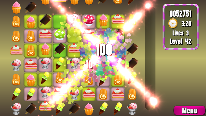 Jak pro utkání umístěním 3 nebo více koláče stejného typu vedle sebe buď v horizontální nebo vertikální uspořádání. Chcete-li vymazat každou úroveň, musíte vyplnit výplně baru v právu a / nebo zlomit pod dorty všechny dlaždice, ztratíte život, pokud vyprší čas. Můžete si také aktivovat lysohlávky a barevné kuličky tím, že zápas je dotýká.
