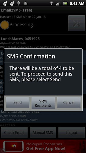 - Potvrzovací vyskakovací pole se objeví, s uvedením příjemců, sms, na které se zasíláte, na které chcete zasílat, na na ně SMS.