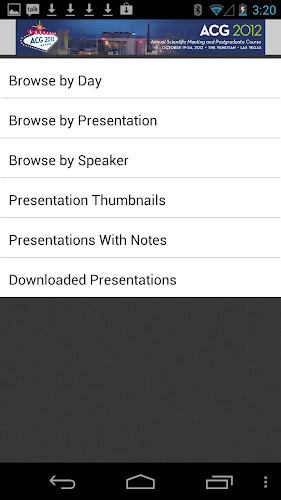 *** pouze pro účastníky konference ***Mobilní aplikace ACG 2012 vám poskytuje přístup k prezentacím z každoročního vědeckého setkání a postgraduálního kurzu 2012. Pomocí prstů můžete nakreslit a zvýraznit přímo na snímky a na každém snímku si můžete dělat poznámky. Všechny vaše poznámky jsou uloženy online, takže k nim můžete přistupovat později prostřednictvím online osobního shrnutí.
