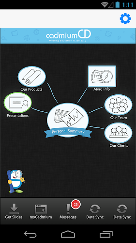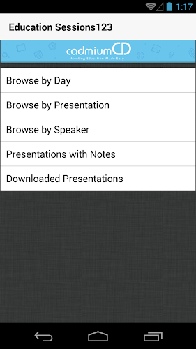 Mobilní aplikace CadmiumCD umožňuje prohlížet prezentace, abstrakty plakátu, detaily reproduktorů a vystavovatele z kurzu. Uživatelé si mohou dělat poznámky sousední dostupné prezentační snímky a nakreslete přímo na snímcích uvnitř aplikace. Poznámka je k dispozici také v modulu vystavovatelů.Kromě toho mohou uživatelé sdílet informace s účastníky a kolegy s aplikacemi v aplikacích, tweeting a e -mailem.