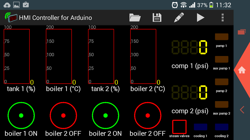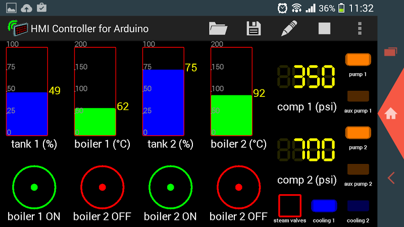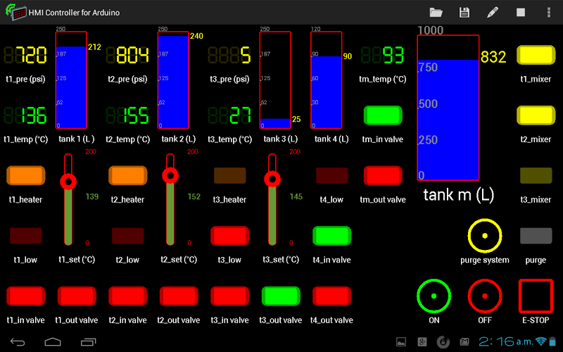 Systém HMI Controller pro Arduino je aplikace pro Android OS, která umožňuje připojit Arduino desku (UNO a Mega) se svým zařízením Android jednoduchým způsobem, to může být připojen přes Bluetooth nebo LAN (Local Area Network), aniž by potřeba pochopit něco o Android programování, a to i bez nutnosti znát spoustu funkcí nebo psaní rozšířený kód do vašich Arduino náčrtu, aby komunikace. HMI Controller spravuje všechny řídící proces kolíky a proměnné deklarované v projektu Arduino.Vytvořte si vlastní přizpůsobitelné HMI aplikace bez nutnosti použití počítače, můžete si vybrat ze sedmi různých objektů (widgety): tlačítko, vypínač, vedl Displej 7 segmentů, numerický displej, indikátor bar, slider a grafů.