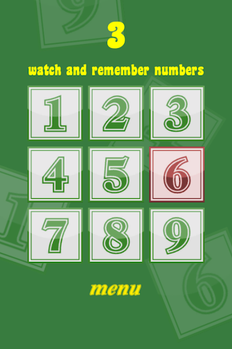 Test čísel je opravdu zábavný způsob, jak otestovat, jak rychle si pamatujete číslo klíče. Ve hře je panel kódu klíčů s devíti čísly a vaším jediným cílem je pamatujte správnou kombinaci čísel. Tento test paměti začne s jedním číslem, poté Continuos se dvěma čísly a poté tři čísla a tak dále, dokud stisknete nesprávné číslo. Na kódu klíče získáte jeden bod každého zapamatovaného čísla. Tato hra je překvapivě zábavná, navzdory jednoduchému nápadu a skvělému způsobu, jak otestovat vaši krátkou paměť. Skvělá hra pro porovnání vašich výsledků se všemi svými přáteli.[Funkce]