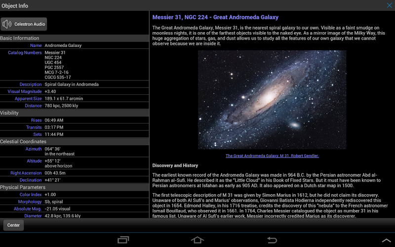 Simulujte noční oblohu a naplánujte si svou pozorovací relaci pomocí vlastního seznamu nejlepších objektů dnešního dne na váš přesný čas a umístění. Chcete vědět, zda bude dnes večer vidět Jupiterova skvělá červená skvrna? Podívejte se dopředu a uvidíte nebo oživujete tranzity, zatmění a další nebeské události. Podívejte se na stovky fotografií nebo poslouchejte více než čtyři hodiny zvukového vyprávění, abyste zvýšili váš zážitek z hvězd.