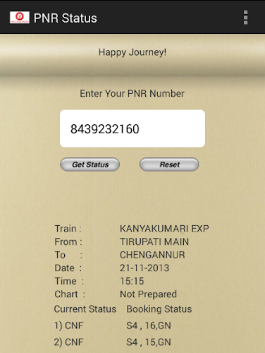 Check Indian Railway PNR status with a simple and attractive user interface.Retrieve the train name, boarding point and train timings along with the seat allotment details.