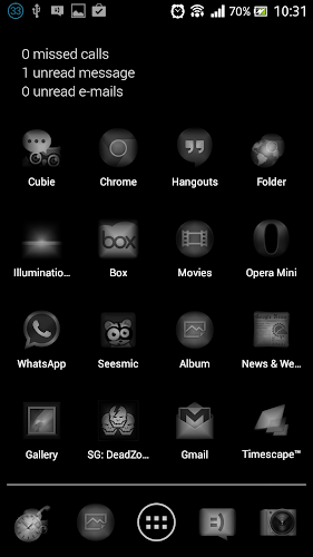 important: theme only works on nova, apex, adw, action and SmartLauncher. Budoucí aktualizace, aby to fungovalo na Go a holo Launcher stále probíhá.