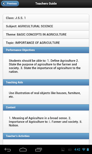 brainfriend Teacher’s guide (btg) je mobilní instruktážní příručka pro učitele v Nigérii. je to nejpřednější digitální a mobilní aplikace, která učitelům na mobilních zařízeních poskytuje nigerijské učební osnovy schválené nigerijskou radou pro výzkum a vývoj ve vzdělávání (nerdc). má také vzorové poznámky k hodinám, které vedou učitele, rodiče, školní administrátory a všechny ty, kteří se zabývají předáváním znalostí nebo dohlížejí na ty, kteří předávají ve třídách zahrnutých v národních osnovách.S touto aplikací jsou učitelé/rodiče a zúčastněné strany lépe vybaveni k tomu, aby znali předměty nabízené v každé třídě, témata, témata, požadovaný výkon pro každé téma, obsah každého tématu, učitele a studentské pomůcky pro každé téma. vzorové hodnocení a úkoly k tématu atd.