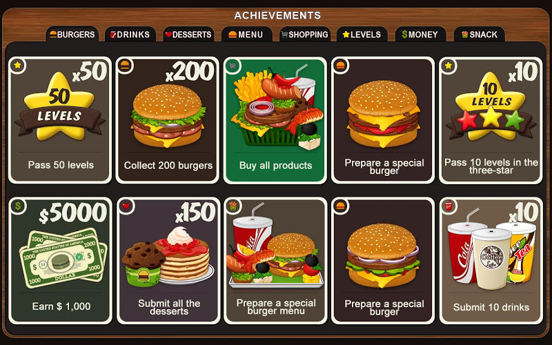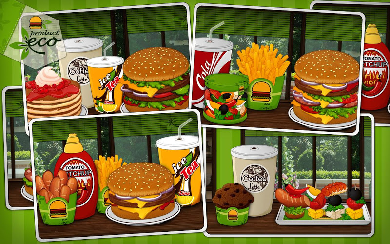 Za vydělané peníze nemůžete koupit nové ingredience a vyrábět menu v kavárně „Eco Burger Chef“. Pak se vaše kavárna stane populárnější a navštívena.