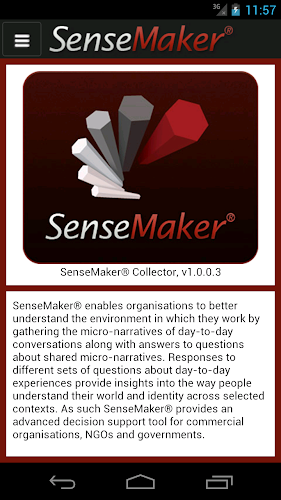 Analýza A Revize Aplikací Pro Android: SenseMaker® Collector, Vyvinuté Společností Cognitive Edge. Uvedeno V Kategorii Nástroje. Aktuální Verze Je 1.0.0.28, Aktualizována Na 06/06/2019 . Podle Recenzí Uživatelů Na Google Play: SenseMaker® Collector. Dosaženo Více Než 3 Tisíc Instalací. SenseMaker® Collector Má V Současné Době Recenze 16, Průměrné Hodnocení 4.2 Hvězd