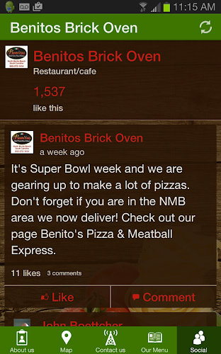 Jaký druh pizzy podáváme? je to pizza ve stylu new york, pizza ve stylu chicago nebo co? to je benitův styl! můžete sedět u baru a dívat se na vaši pizzu vyrobenou před vámi. jde do cihlové pece vytápěné dřevem, která je tak horká, že pizzy, calzones a strombolis jsou hotové během několika minut.