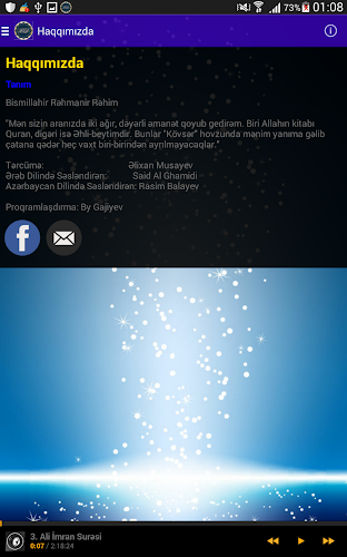 Analýza A Revize Aplikací Pro Android: The Holy Quran (voice), Vyvinuté Společností ByGajiyev. Uvedeno V Kategorii Knihy A Referenční Materiály. Aktuální Verze Je 1.5.10.32, Aktualizována Na 20/10/2017 . Podle Recenzí Uživatelů Na Google Play: The Holy Quran (voice). Dosaženo Více Než 10 Tisíc Instalací. The Holy Quran (voice) Má V Současné Době Recenze 487, Průměrné Hodnocení 4.8 Hvězd