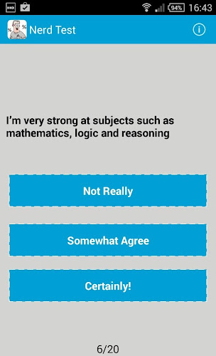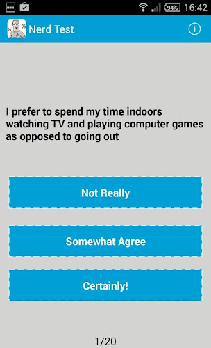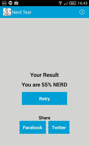 Analýza A Revize Aplikací Pro Android: Nerd Test, Vyvinuté Společností Consurgo. Uvedeno V Kategorii Zábava. Aktuální Verze Je 1.1, Aktualizována Na 24/08/2015 . Podle Recenzí Uživatelů Na Google Play: Nerd Test. Dosaženo Více Než 5 Tisíc Instalací. Nerd Test Má V Současné Době Recenze 54, Průměrné Hodnocení 3.7 Hvězd
