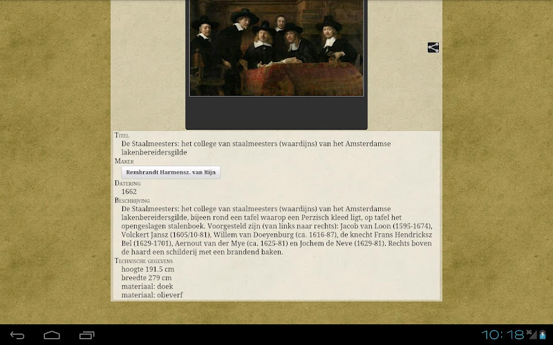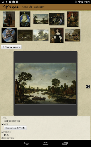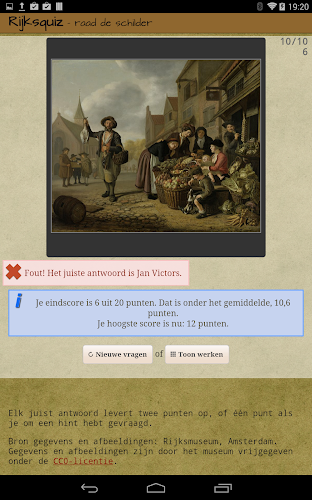 Vyzkoušejte své znalosti malby. Kdo je malíř? Můžete vidět deset obrazů ze sbírky Rijksmuseum, jehož jméno výrobce musí uhodnout. Můžete požádat o nápovědu, ale pak získáte méně bodů. Poté si můžete díla znovu...
