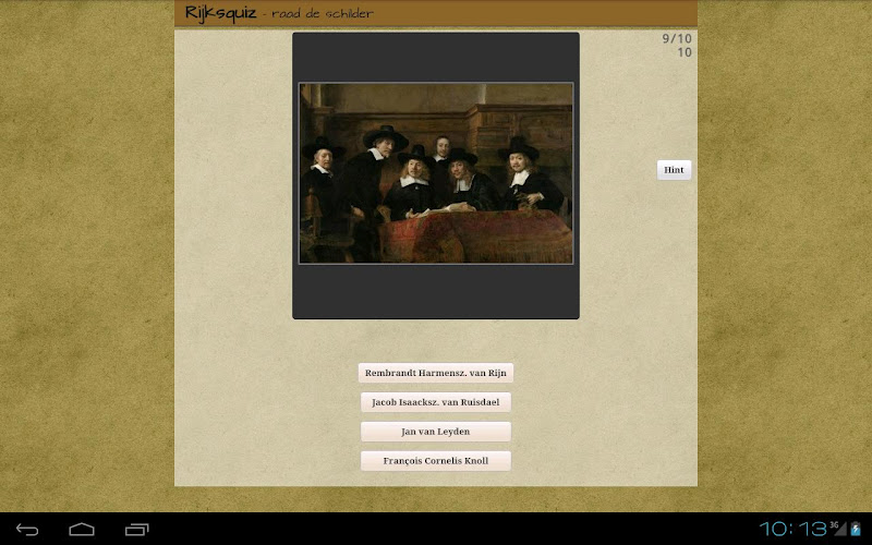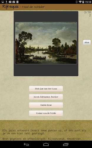 Vyzkoušejte své znalosti malby. Kdo je malíř?Můžete vidět deset obrazů ze sbírky Rijksmuseum, jehož jméno výrobce musí uhodnout. Můžete požádat o nápovědu, ale pak získáte méně bodů.