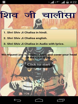 bezplatná aplikace off-line, obsahuje Shree Shiv Ji Chalisa v hindštině, angličtině a zvukovém formátu. Shiv Chalisa (Hindi: शिव चालीसा, doslova čtyřicet Chaupais na Šivě) je oddaná píseň specializovaná hinduická...
