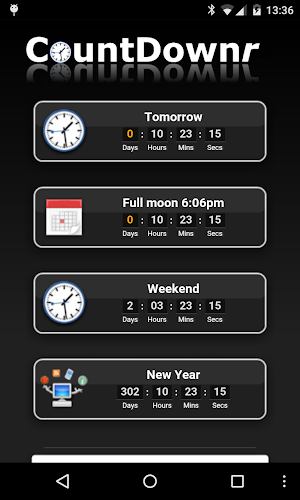 CountDownr vám umožní vytvořit si vlastní kolekci čítače odpočítávání. Každý čítač je upraven tak, aby jeho vlastní čas a datum, kdy se zhasne. Existují dva typy přepážek:- pulty pro konkrétní datum a čas. Tyto čítače lze opakovat denně, týdně, měsíčně nebo ročně, které předem automaticky výstrahy zhasne. Jsou ideální pro připomenutí na jednorázové akce, polední přestávky, o víkendech, platit své měsíční účty, nebo narozeniny a svátky.