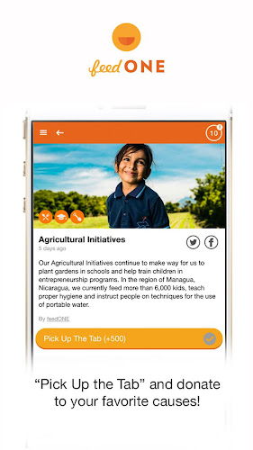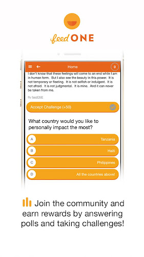 Feedone je odhodlán poskytovat jídlo všem. Jídlo otevírá dveře vzdělání, čisté vodě a naději. Feedone s námi.Připojte se k ostatním uživatelům z celého světa v měsíčních kampaních zaměřených na zvýšení povědomí o cílených zemích a jejich potřebách. Zůstaňte informováni o čerstvých nových příbězích o změně a zúčastněte se týdenních výzev Feedone Community.