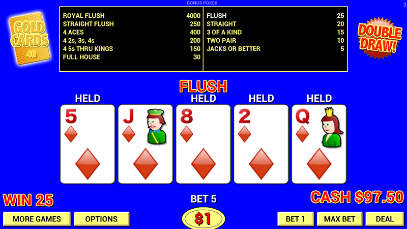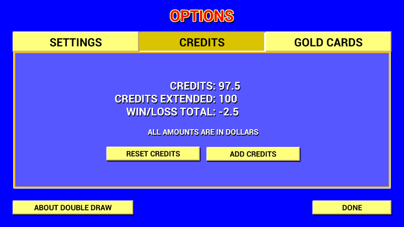 Double Draw Video Poker vás nepožaduje, abyste si zakoupili další kredity z obchodu Play. Upřímně řečeno, myslíme si, že je to hrubé a ne zábavné. Takže, Double Draw Video Poker vám umožňuje přidat kredity ve 100 $ incementů, jak často chcete. Pokud tedy vaše video pokere nejčistší, můžete zakázat funkce dvojitého remízy a zlaté karty a tuto aplikaci použít jako standardní video pokerovou hru - aniž byste museli zakoupit další kredity.