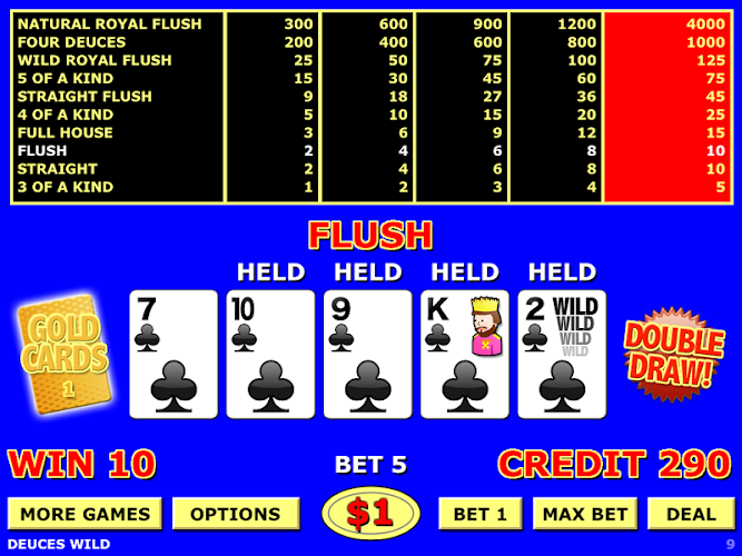 Víme, na co si myslíte ... “Ach, další aplikace pro video pokeru“. Proč se tato aplikace pro video pokeru liší od všech ostatních? No, tenhle má velký zvrat. To vám umožní nakreslit podruhé! Umístíte sázku, 1 až 5 kreditů. pak klepněte na „Deal“. Vyberte karty, které chcete ponechat, a klepněte na „Draw“ a jak se očekávalo, nakreslíte nové karty. Teď je to zvrat. Pokud chcete, můžete karty znovu nakreslit! Budete muset zaplatit stejnou částku jako původní sázka a budete se muset vzdát všech výher, které jste vyhráli při prvním losování. Ale jakékoli výhry z druhého losování, které ponecháte! Takže, pokud máte 4 karty na Royal Flush, můžete znovu nakreslit, abyste se pokusili získat! Jak zábavné je to?!?Další jedinečnou funkcí jsou „zlaté karty“. Shromažďujete zlaté karty hraním hry nebo je zakoupete jako nákup v aplikaci. Poté, co jste nakreslili karty (možná dvakrát), můžete použít zlatou kartu k nahrazení jedné karty jakoukoli kartou, kterou chcete. Deuces Wild