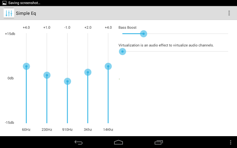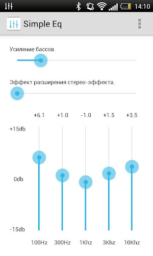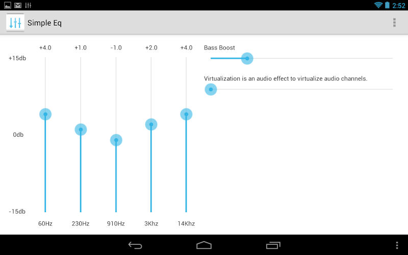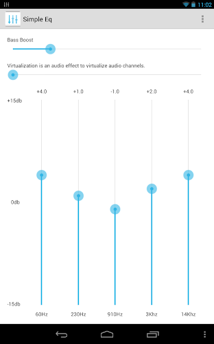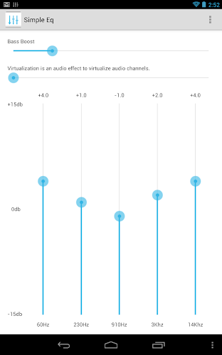 Jednoduchý ekvalizér pro vaše zařízení. Umožněte vám zlepšit zvuk zařízení, změnit objem zvukových efektů a hlasitova ekvalizéru 5 pásů. Můžete použít jednoduché EQ s hráči, jako jsou Pandora, Spotify, Tunein Radio, Mosic z VKontaKte a Other. je zvukový efekt pro zvýšení nebo zesílení nízkých frekvencí zvuku.- Virtualizace. je zvukový efekt pro virtualizaci zvukových kanálů.