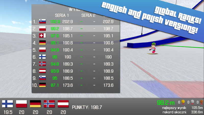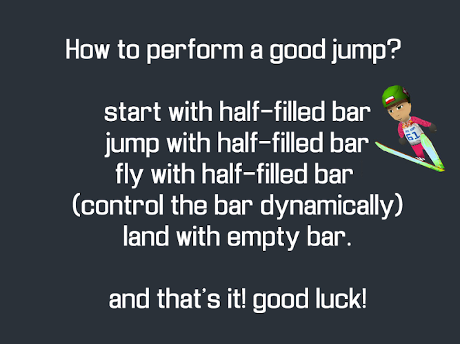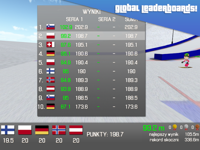 Existují normální kopec (K-95) a velký kopec (K-125) podporován! Normal Hill je pro začátečníky a poloprostorance, zatímco velký kopec je určen pro pokročilé hráče. Také globální žebříčky jsou k dispozici prostřednictvím her Google Play Games. Na normálním kopci!