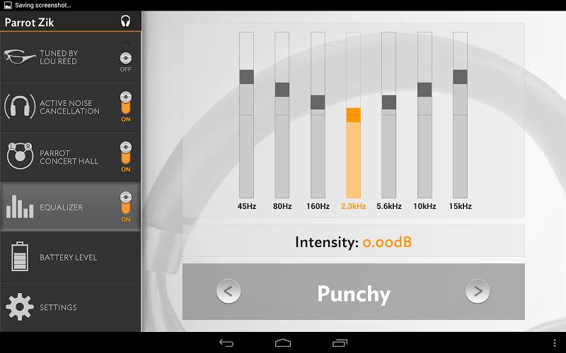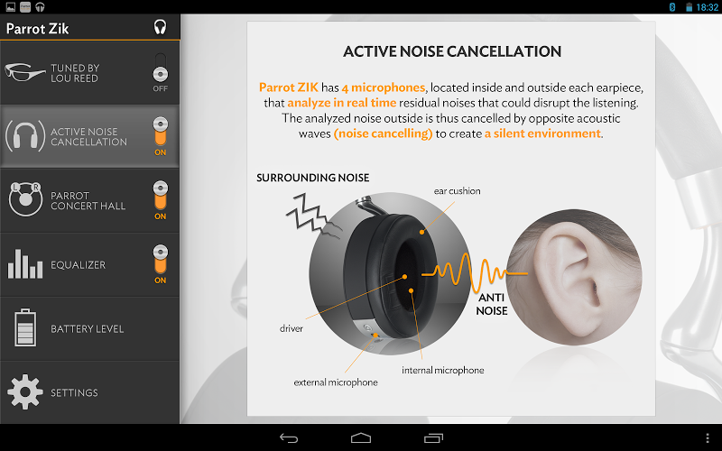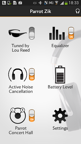 Aplikace Parrot Audio Suite vám umožňuje současně nakonfigurovat nastavení pro sluchátka ZIK a sólový reproduktor Zikmu navržený společností Starck.(není kompatibilní s papouškem Zik 2.0 ani Parrot Zik 3)