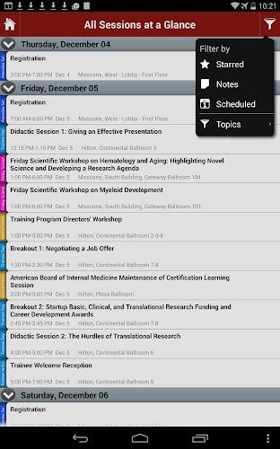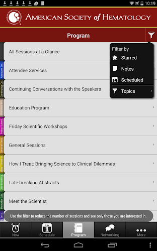 • Program: Procházejte celý program události pro vytvoření osobního rozvrhu, záložek nebo reproduktorů nebo přístupových relací, jak je k dispozici.