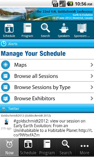 Standardní konferenční aplikace eventpilot pro aplikaci goldschmidt 2012 zahrnuje:• nativní aplikace: pro přístup k programu konference, plánu nebo animovaným mapám není potřeba žádné připojení Wi-Fi.