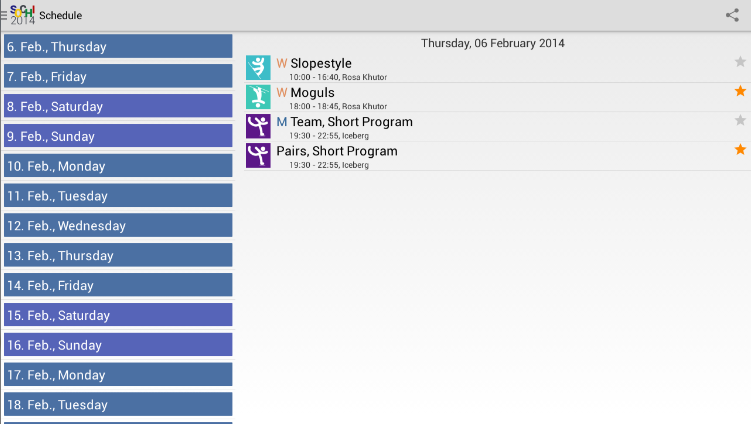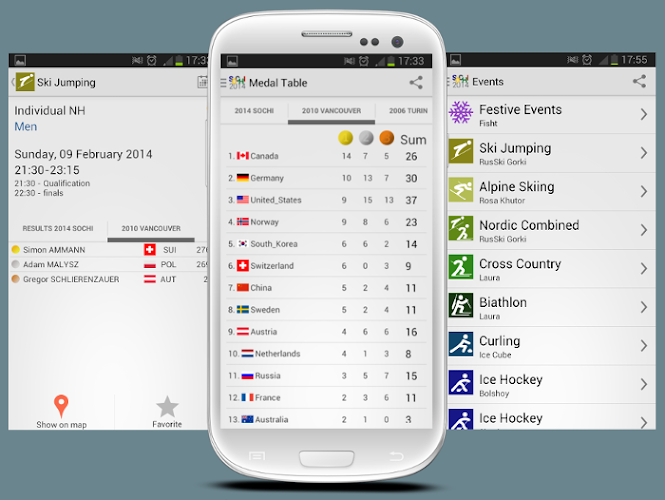 Nejatraktivnější, nejužitečnější, intuitivní a jednoduchá aplikace pro zimní olympijské hry 2014 v Soči. Je to skvělá aplikace pro sledování událostí a olympijských soutěží. Vytvořte seznam oblíbených položek a máte pohodlný přehled o nich. Podívejte se na současné postavení medailovou tabulkou všech zúčastněných olympijských národů. Zůstaňte v kontaktu s nejnovějšími událostmi!Toto je neoficiální aplikace, všechny informace jsou poskytovány bez jakékoli odpovědnosti.