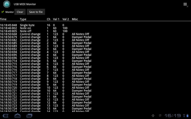 Monitor USB MIDI vám umožňuje zobrazit všechny příchozí události MIDI z vašeho rozhraní USB MIDI. Události jsou časově vyšetřeny a typ události, MIDI kanál a hodnoty jsou zobrazeny v tabulce svitku. Pro změny ovládání se zobrazí další informace, pokud je změna ovládání známým typem, jako je hlasitost nebo posouvání. * Tablet nebo telefon s podporou hostitele USB* USB MIDI rozhraní, které funguje bez ovladačů na Windows nebo OSX