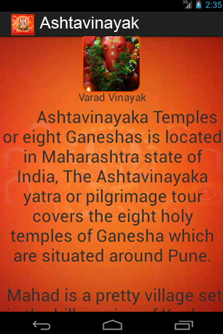 ganapati bappa morya !!!!!!!! mangal murti morya!!!!!!!!!!!!!!”ashtavinayak” - je jedinečná aplikace, která není ničím jiným než shlukem 8 chrámů ganesha (ashtavinayak) z maharashtra, indie. tato aplikace ”ashtavinayak” poskytuje: