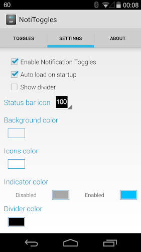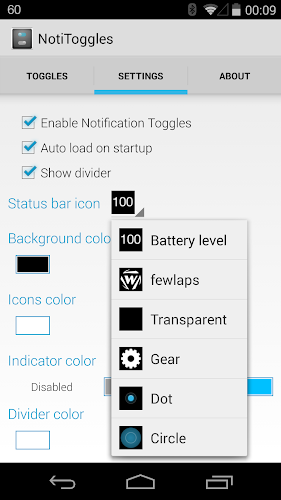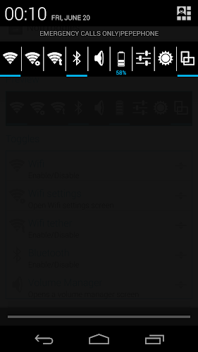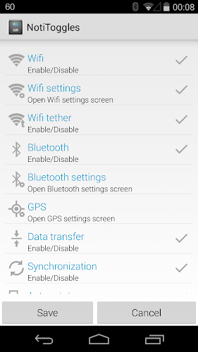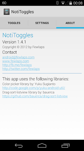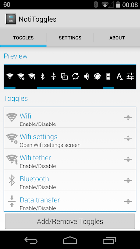 Notitoggles přidává oznámení ve vašem stavovém řádku s zkratky a přepínáním do většiny použitých nastavení. Nemusíte ponechat žádnou aplikaci, abyste přepnuli Wi-Fi, Bluetooth, GPS, hlasitost, jas obrazovky ...== Přizpůsobení ==