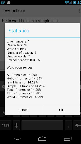 - Statistiky textu, které zahrnují počet slov, čísla řádků, počet znaků, počet prostorů, výskyty slov včetně procent