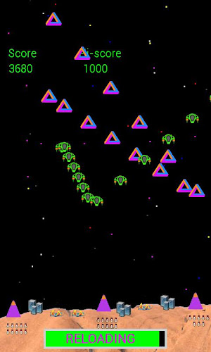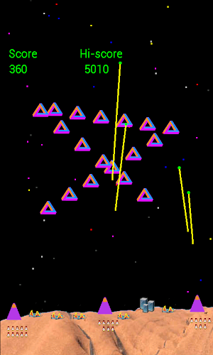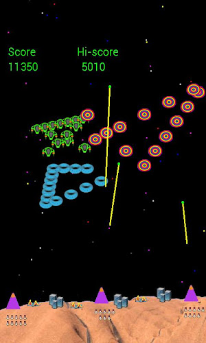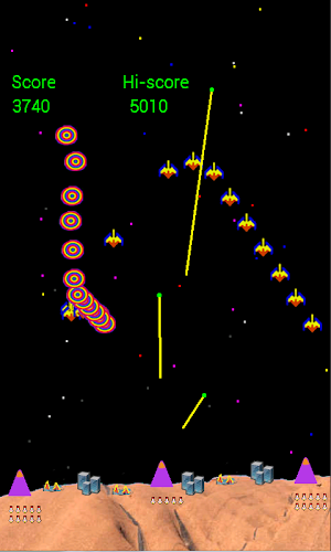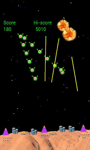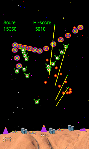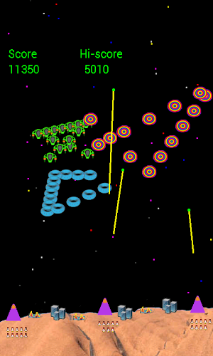 Aliens proudí na obrazovku jako obří vesmírné vlaky, rostoucí délku, čím dále postupujete. Vaším úkolem je zničit je a bránit se proti útočníkům Kamikaze, kteří potápějí bombardování vašich měst.