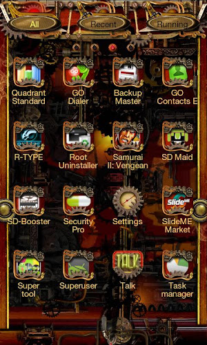 This Steampunk theme is for the Go Launcher Ex home replacement app. If you do not have it installed please download it from the market. Once you have installed Go Launcher Ex. Download this theme and install it. Press menu - themes - and select Steampunk.