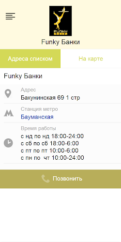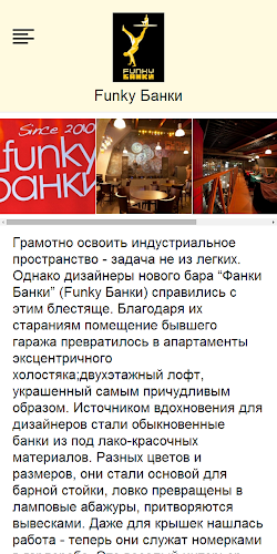 funky banky - je: * no, spousta různých plechovek * ogromennye hall cloudová místa s obrovským barem a elegantní scénou * balkon s různobarevnými pohovkami, on je litinový most přes ogromenny hall * chill out pro velké a nepříliš společnosti * snesposlannye ruka drogové prozřetelnostivyjádřená ve velkém množství koktejlů edomopodobnyh a nyní v mnoha mobilních barech a barových pasážích aplikace, přes kterou si můžete snadno objednat doručení domů.