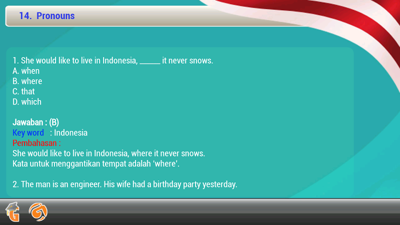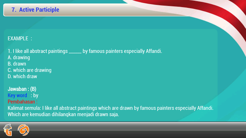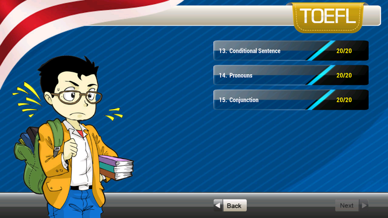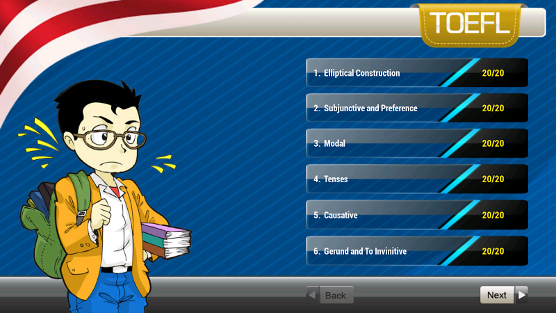 gramatické prvky, které se často testují v testu TOEFL, jsou již v této aplikaci probírány a následují příklady. jasné a úplné. V testu TOEFL je v této části testováno mnoho gramatických prvků. Abyste mohli odpovědět na otázky v této sekci, musíte si prohloubit své znalosti a dovednosti o gramatických prvcích.