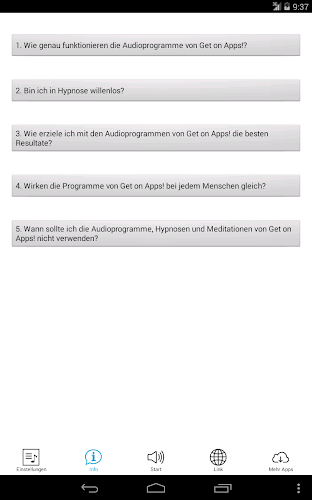 Neposlouchejte prosím tento program při řízení nebo při činnostech, které vyžadují vaši plnou pozornost. Program nenahrazuje návštěvu lékaře ani léky, které potřebujete z důvodu nemoci. Hypnóza je v zásadě vhodná pro všechny fyzicky i psychicky zdravé lidi. Měli byste být v terapeutické léčbě, např. Pokud trpíte depresí nebo psychózou a/nebo užíváte léky na předpis, poraďte se před použitím tohoto programu se svými rodiči a lékařem. Program nenahrazuje léčbu patologických úzkostných poruch. Další informace o hypnóze a použití hypnózy naleznete také na get-on-apps.com.