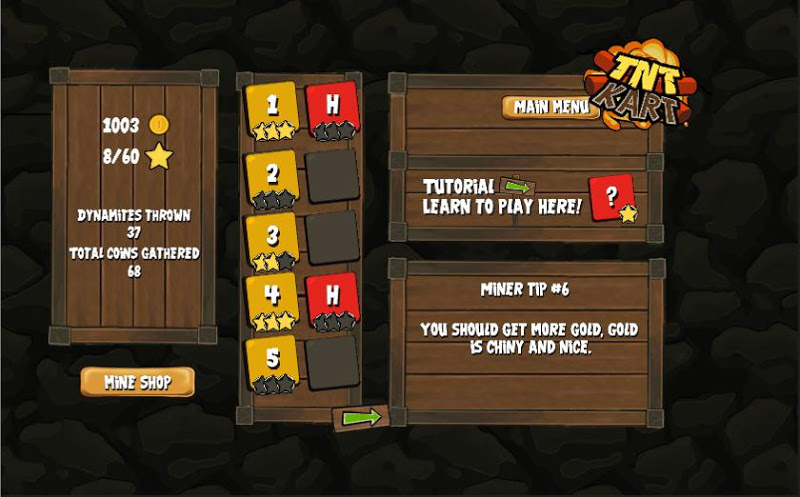 Prezentujte hru GCC vyhrávající TNT Kart!Narazili jste na opuštěný důl, který stále obsahuje hromady zlata! Bohužel rozbité stopy a Fallen Rock vytvořily nebezpečí, která se skrývají kolem každého ohybu. S robustním těžebním motokárem a pěstí plnou dynamitu, sbírejte veškeré zlato, které můžete, zatímco se vystřelíte přes překážky. Můžete přežít dobrodružství, zbohatnout a žít znovu jezdit?