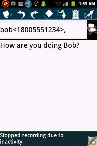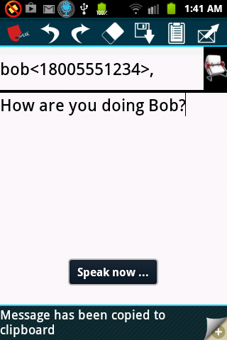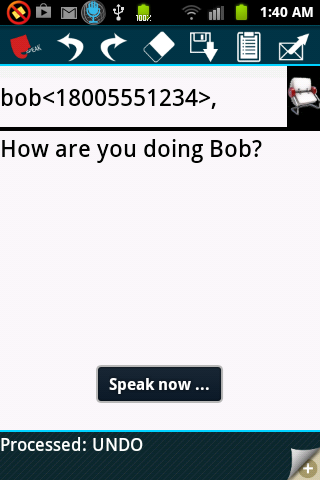 Rozpoznávání řeči je zapnuté a pokračuje, když jste v aplikaci. Můžete zastavit/začít nahrávat kliknutím na tlačítko záznamu, v levém horním rohu obrazovky. Všimněte si, že musíte dokončit vyjádření své zprávy v době, kdy je viditelná zpráva „Speak Now“, po kterém zařízení přestane poslouchat a pokračuje směrem k dešifrování věty. Jakmile se zpráva znovu objeví, můžete začít s další větou. Musíte zařízení dát nějaký čas, zatímco to rozpoznává vaši řeč. Spusťte další větu, jakmile se znovu objeví pole zprávy „Speak Now“. Jednoduše opakujte tyto kroky jeden po druhém a dokončete svou řeč. • Redo (příkaz rozpoznávání hlasu: „Redo Redo“): Pokud chcete přivést zpět svůj vrácený text (ne kontaktní číslo), stiskněte tlačítko Redo. a začít znovu. Pokud náhodně vymažete, stačí stisknout tlačítko UNDO.